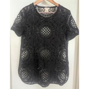 Sundance Crochet Lace Shadow Dance Tee Top Black Sheer Short Sleeve Size Small