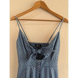 Lulus Exclusive! Drift into your best daydream in the Lulus Bonnie Bell Blue and White Polka Dot Midi Flare Dress! The casual and darted front-tying bodice sits atop a button-up A-line skirt with super cute, hidden side seam pockets. Adjustable spaghetti straps.