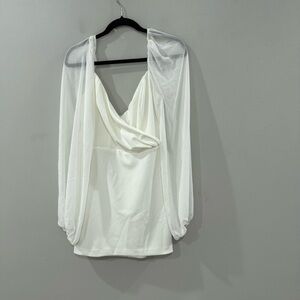 Slip into this showstopping minidress for a bridal look fit for any occasion! Wrap details couple with a sweetheart neckline for a romantic touch while flowy sleeves add movement.