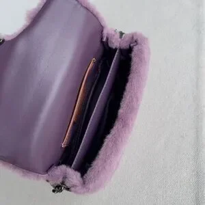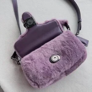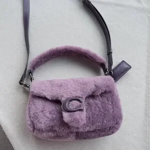 Chic and plush lavender fur bag by Coach. Features a stylish handle and adjustable strap.
