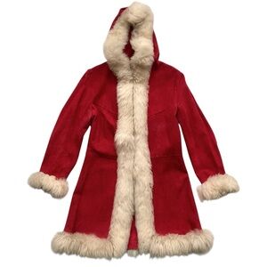 insane vintage 1970s penny lane coat πΊ fits like a size s β’ features a red genuine suede, knee length fit, hook & eye closures & cream fluffy sheep fur trim π€― so unique reminds me of little red riding hood !!