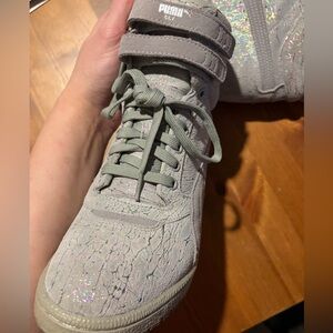 PUMA Sky Wedge Iridescent Suede Gray High Top Sneaker with Crackle Texture