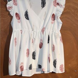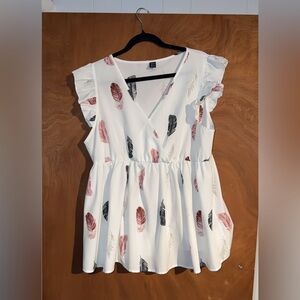Chic maternity blouse with feather design. Features ruffled sleeves and a flattering fit. Ideal for versatile styling.