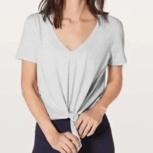 Chic and comfortable short sleeve tee. Perfect for everyday wear or your athletic adventures! Super soft fabric with a v-neck, front tie relaxed fit.