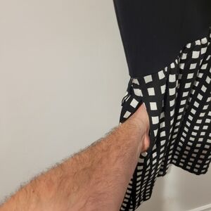 Chic mini dress with a black top and white grid pattern skirt. Perfect for stylish outings.