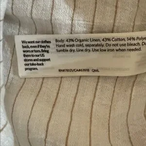 Minimalist and capsule dressing. Beige and white striped shirt. Button-down front. Casual and stylish. Organic linen cotton blend. Comes from a smoke free home.