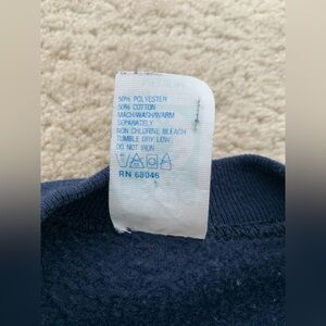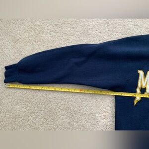 Navy crewneck sweatshirt with Michigan football helmet in puffy textured letters.
