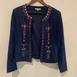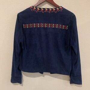 Bojo Western Style Aztec Embroidered Fringe Jacket-Suede Look Navy Blue- Size M