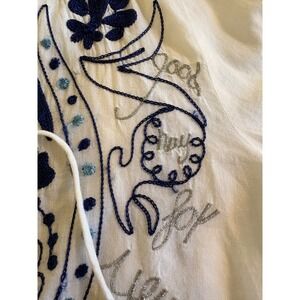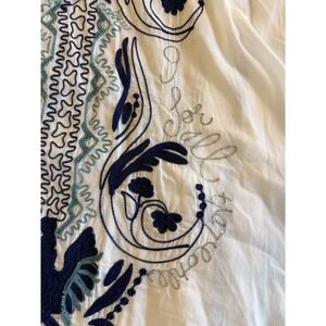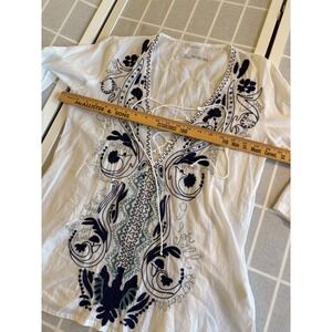 Gauzy Cotton White & Blue Embroidered Shirt Silver Threading Tie Deep V Neck SzL