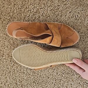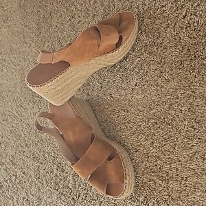 Juncal Aguirre wedge sandals, made in Spain, suede straps, honey color