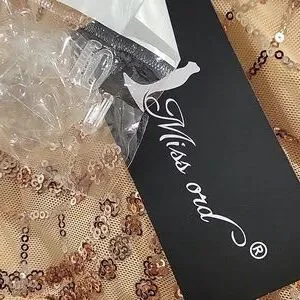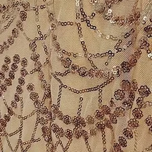 Shine in this stunning gold sequin evening gown. Perfect for special occasions, this dress offers a glamorous look with its intricate sequin design. Make a statement with elegance and style. size L but may fit a medium size better as it seems slim fit. it is to be worn right off the shoulders, and it brings the clear straps. long sleeves & very long mermaid style. fully lined including the sleeves. it is beautiful and gold in color. waist measurement is approx 14" it has very little stretch. pit to pit approx 15", length top to bottom approx 64". sleeve length from pit to end approx 19". it is more lightweight than some other sequence dresses. back zipper and no slit, padded chest.