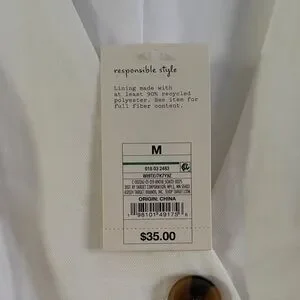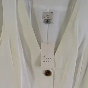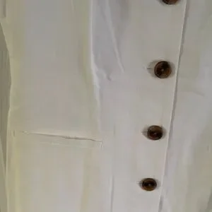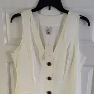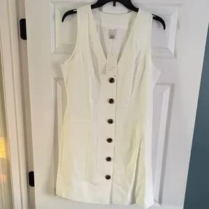 Chic off white dress with a sleeveless design. Features a stylish button-front detail. Faux pockets in front.