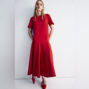 Calf length dress in a vibrant red twill. Round neck line, keyhole, opening at back of neck with concealed button, short sleeves, and a flared skirt with inserts that make a beautiful draping and moving affect that gives add volume.