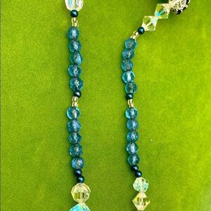 The 4-squared, faceted Blue Crystal forms the centerpiece of this gorgeous necklace and adds to the beauty of this well-faceted Clear and Blue crystal beaded necklace