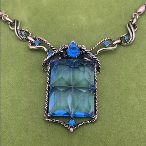 Gorgeous Vintage Royal Blue Sapphire Czech Crystal Pendant Beaded Necklace, in Silver plate **USE with care as the prongs on the cabochon tend to slip**