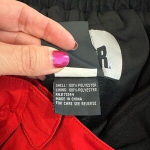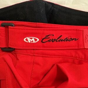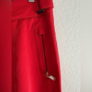 Marker red ski pants with two front zip pockets and an additional leg zipper. Features elastic at the back waist, adjustable velcro tabs to adjust the waist, and boot gaiters for dry protection.