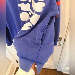 Cobalt blue oversized crewneck with bold red racing stripes across the chest and sleeves and large white abstract floral graphic. Embroidered FP Movement logo on back. POCKETS! And cute flattering notch on side hems.