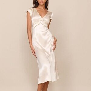 Elegant satin midi dress by Reformation. Features a V-neck and cap sleeves. Ideal for any event.