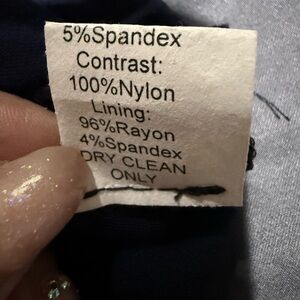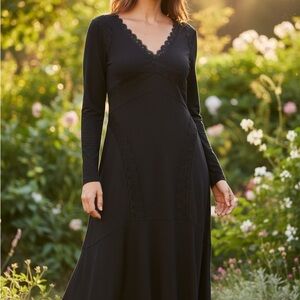 Chic dark navy dress with lace accents. Long sleeves and V-neckline. Perfect for elegant occasions.