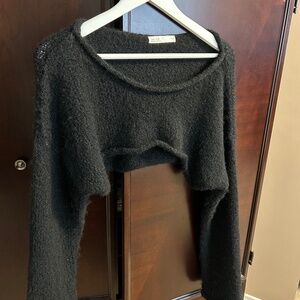 Chic black cropped knit sweater with a soft, fuzzy texture and modern silhouette. Features a wide scoop neckline, long sleeves, and a dramatic cropped hem - perfect for layering or styling.