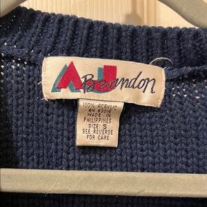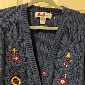 Chic navy cardigan with intricate multicolor embroidery. Perfect for layering. Has wear from being 30-35 years old.