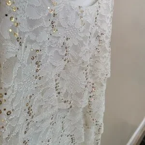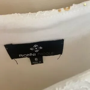 This stunning Ronni Nicole dress features a sleeveless design with a scoop neckline, perfect for a bridal or cocktail occasion. The white and cream hues complement the tiered, ruffled layers that cascade elegantly, creating a romantic silhouette. Ideal for weddings, this sheath dress embodies timeless elegance and sophistication.