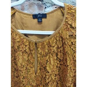 Elevate your wardrobe with this beautiful J.Crew top, featuring an intricate floral lace overlay in a rich mustard yellow color. This women's plus size 2X blouse is designed with comfortable short flutter sleeves and a stylish keyhole neckline. A soft, coordinating lining provides full coverage, making this piece both elegant and easy to wear. This versatile pullover top is perfect for adding a touch of sophistication to any outfit.