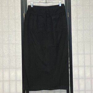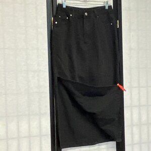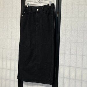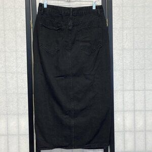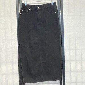 High Rise Straight Side Slit Pencil Jeans Midi Skirt from Shein. Lovingly worn – looks in excellent preowned condition. Hi rise, slim silhouette in stretch black denim. Belt-loop waistband with button and zip fastening. Above knee high slit on right side. Classic back yoke, 5 pocket design and double stitched seams. Seam down center back. Hits above ankles. Note: Some photos edited to enhance details - skirt is solid black. Hugs your curves with stretch comfort and sleek style.