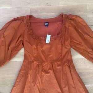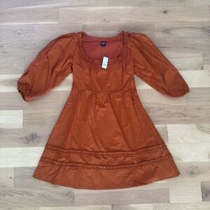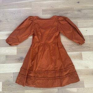 Elegant terracotta dress with stylish puff sleeves. Ideal for versatile wear.