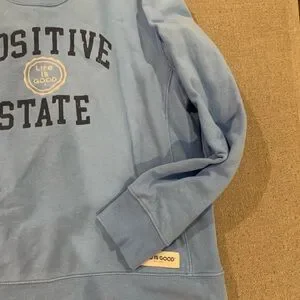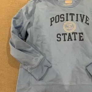 Light blue crewneck with 'Positive State' design. Soft and casual.