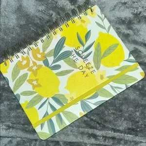 Brand New! 4 different types of paper!! Bright lemon themed spiral notebook with 'Squeeze the Day' text. Features yellow lemons and green leaves on the cover.