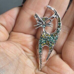 This sleek figural cat brooch features a curved, elongated silhouette accented with green and yellow rhinestones across the body and tail. The open cutout design adds dimension while keeping the piece lightweight and easy to wear. Secures with a functional C clasp. No flaws noted.
