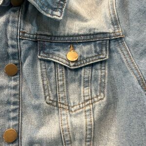 Stylish denim jacket with ruffle trim. Perfect for a chic, casual look.
