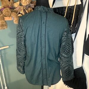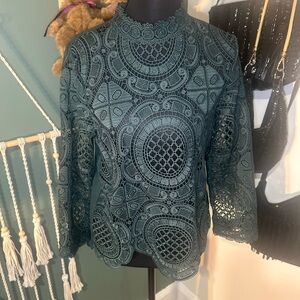Romantic teal lace blouse by James Coviello featuring an intricate crochet-style lace overlay and scalloped hem. Semi-sheer lace throughout with a solid woven back panel and button closure. Feminine, elevated, and perfect for layering with strong early 2000s boutique boho vibes.
