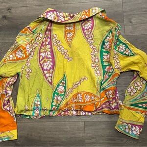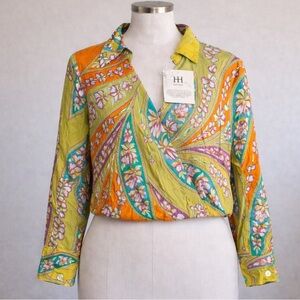 New with tags Haute Hippie designer blouse featuring a vibrant multicolor floral print and flattering faux wrap silhouette. Cropped length with elastic back waist creates a shaped, feminine fit while maintaining comfort. Lightweight 100% washable rayon fabric makes this perfect for resort wear, vacation styling, or elevated everyday outfits.