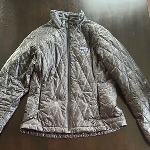Patagonia quilted jacket with a sleek design. Features a full zip and high collar.