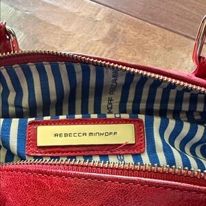 Elegant cherry red leather satchel. Features sturdy handles and detachable strap. Perfect for daily use. The bottom of the bag has a clear protective coating that was an original design feature to protect from stains/water damage. No stains or holes. Interior clean. Zippers all work. Comes from a pet free home. A truly gorgeous bag!