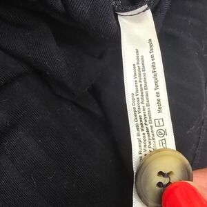 Saturday Sunday By Anthropologie navy ribbed asymmetrical turtleneck sweater top. This piece features a unique diagonal seam detail across the chest and decorative buttons along the left side hem. The ribbed texture adds depth and visual interest to the garment.
