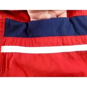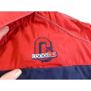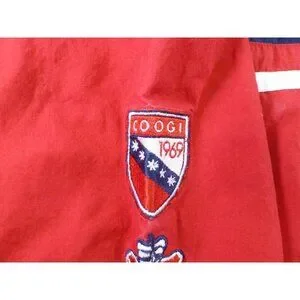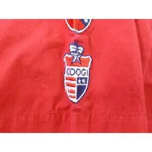 A nostalgic shirt that captures the bold spirit of late 60s fashion, this Coogi piece combines vibrant red with navy blue accents. The playful design speaks to an era of sartorial experimentation, featuring a shield-like emblem that whispers stories of retro cool.