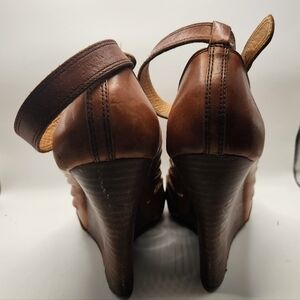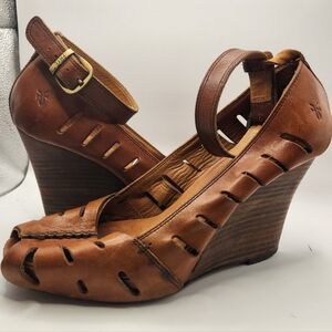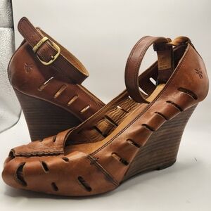 Frye Gwen Ankle Strap Leather Wedge Sandal Cognac Brown 9.5 Boho Hippie Prairie
