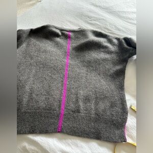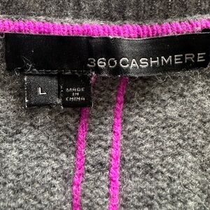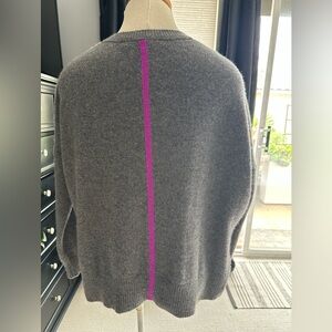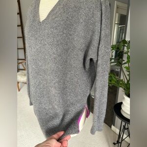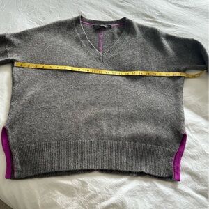 Cozy gray V-neck sweater with purple details at vents and back by 360 Cashmere. 100% cashmere, very soft, excellent quality. Perfect to dress up, work or throw on and look great. Measurements in pics. .