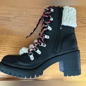 Universal Thread Black and Cream Women's Lace-Up Combat Boots, size 8.5. Make a fashion statement with these Y2K-themed black and cream lace-up combat boots with a 3” chunky heel. There is a side zipper on each boot, making it easier to step in and out of the shoes. They were worn twice and are in excellent condition. No flaws.