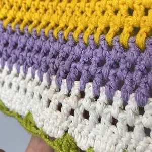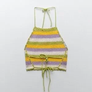 Stripped open back crochet knit high neck halter with tie at neck and two toes at waist.