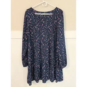 Super cute navy floral babydoll style tunic/dress with long sleeves and flowy fit. Lightweight and comfortable — perfect for everyday wear, brunch, Disney days, or layering with leggings/boots.