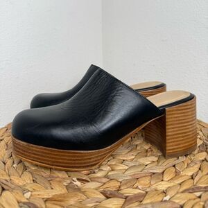 Intentionally Blank Facts Black Leather Clogs Block Stacked Wood Heel
