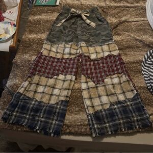 Unique wide leg pants with camouflage and plaid patterns. Features a tie waist for adjustable fit. Stylish and comfortable.