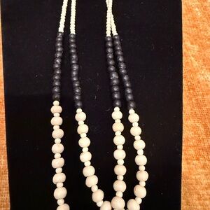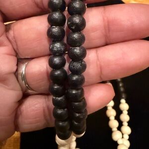 This elegant necklace features a stunning combination of black and cream beads, perfect for any occasion. Its timeless design adds a touch of sophistication and versatility to your outfit. The beads have not been tested- could be bone, stone, wood, or a combination of all. There is a hook closure. Preloved condition and review pictures for any signs of wear before purchasing. 😊