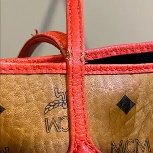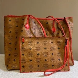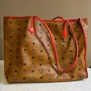 Stylish MCM tote with iconic logo pattern. Features vibrant red handles. Perfect for everyday use.