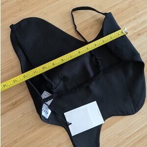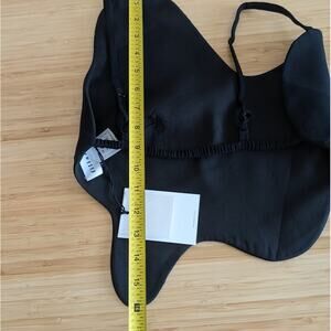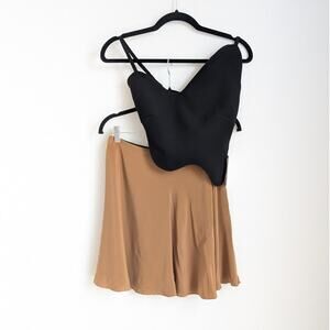 - 100% silk, black wavy, asymmetrical top and fluttery brown mini skirt, an open back and all-around cutout effect at the waist