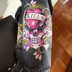 Stylish Ed Hardy winter boots. Black with vibrant pink and purple skull design “LOVE KILLS SLOWLY“ warmest boots you will ever own for winter.